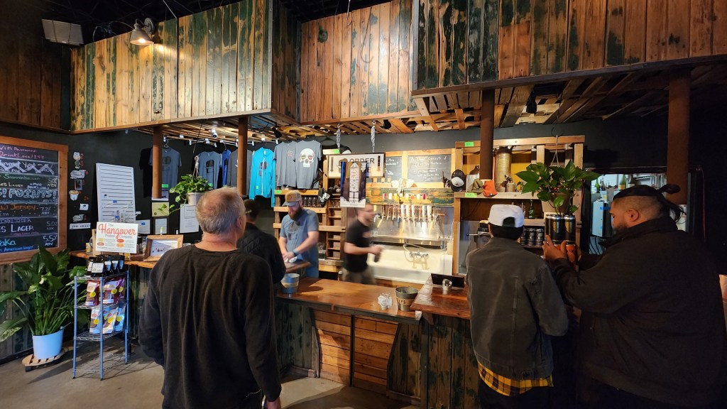 Upon entering the Twin Elephant Brewing Company, we instantly felt a experienced a good vibe and warm, welcoming atmosphere. The entire bar, tables in the tasting room, and the wall behind the bar were all fashioned and built from refurbished / reclaimed wood form an old barn…and it looked GREAT!! There was even a very nice big mural of the company on one wall that certainly added to the warm surroundings of the room. We really liked the hanging plants and other greenery that was scattered aroung the tasting room and above some of the big tables.