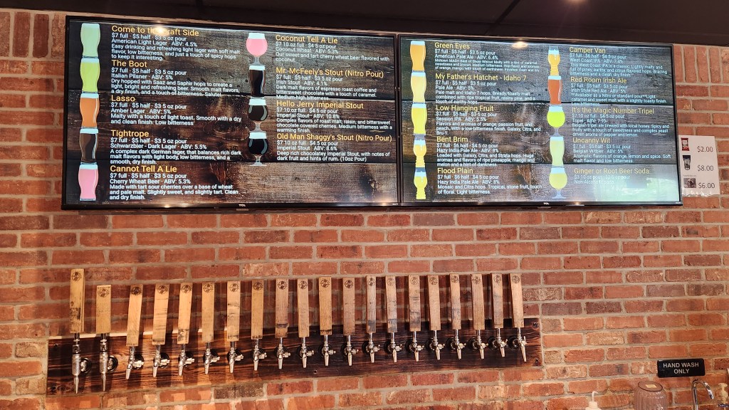 The tasting room is quite roomy and comfortable. There is a decent number of tables and chairs available along with a seating area that has relaxing couches. A wall-sized chalkboard adorns the back wall…listing all of the upcoming events, times, drinks, etc. The brewery is also family/child/pet friendly…a terrific place to bring your family and friends and hang out for a while! Time with friends…great beer…and a welcoming atmosphere…you can’t beat it!!