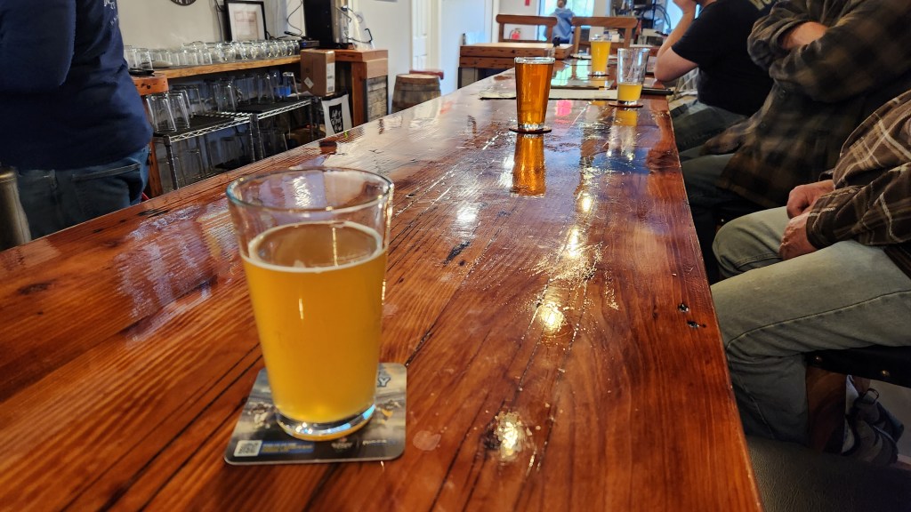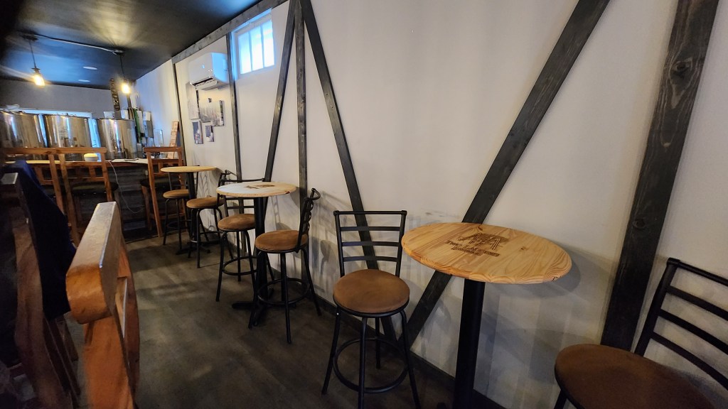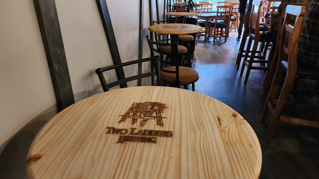 The bar itself was made from reconditioned and refurbished wood from actual docks. There are a couple of fun bar-top games that may keep you entertained as well. There are beautiful, sturdy bar chairs alongside the bar and the smaller bar tables have a wood burned logo of the Two Ladder Brewing Company on the surface. The tasting room/bar room has a neat, clean decor with a wall painting of the brewery’s logo on one side and a nifty headline of the brewery on the opposite wall.