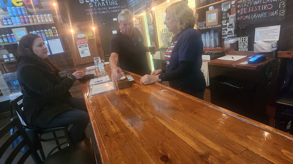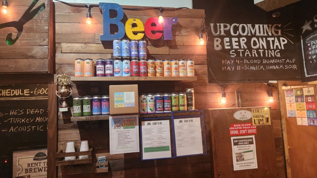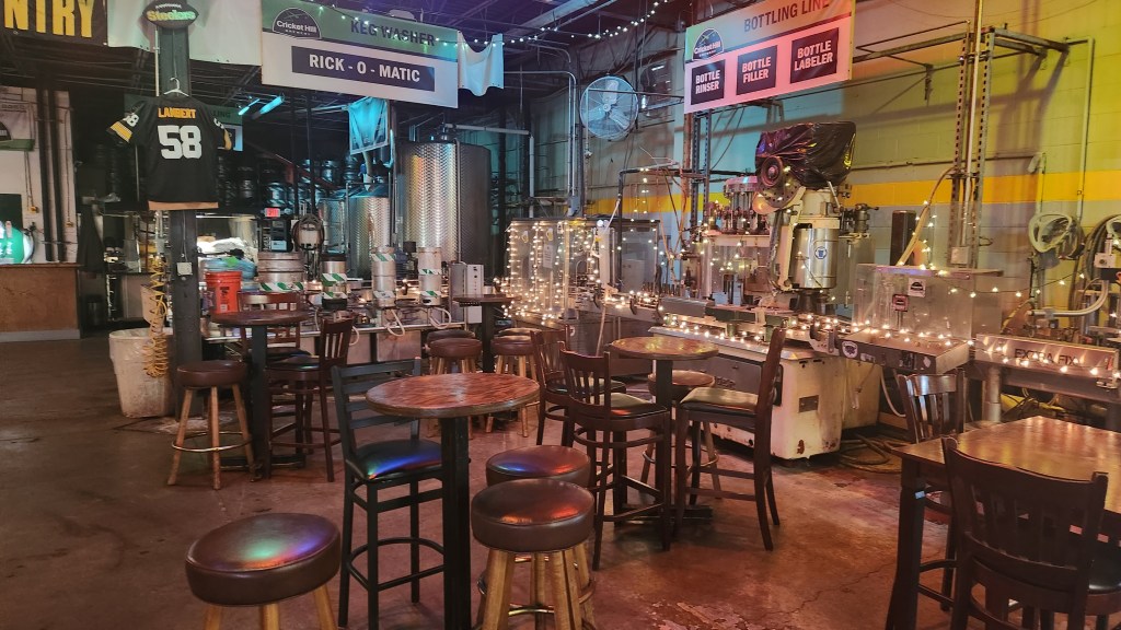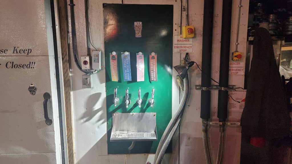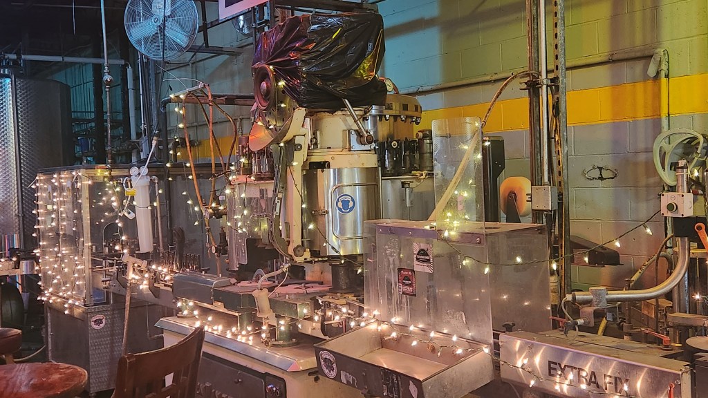 Located in an industrial area of Fairfield, the brewery has a nice outdoor patio where you can go to relax on a warm night. Upon entering the building and meeting the bartenders/owners, you will instantly feel right at home and welcome. We spent some time talking with Co-Owner, Ed Gangi and his wife, Gwen. They are authentically very pleasant, informative, and happy people. Besides the great drinks, they are the other reason why my wife and I enjoy visiting the brewery. The tasting room / bar room is a spacious, comfortable, laid back area that has a warehouse-type decor. There is an old bottling machine, adorned with lights that gives the room a cheerful ambiance. The brewery system/kettles are located in the back of the room and can be clearly seen. For all of you NFL Pittsburgh Steelers fans, owner Rick Reed has a Steeler banner and regalia hanging from the rafters. The bar is made of beautifully lacquered wood. There are several tables scattered throughout the room…some of them actual wooden barrels…very cool!