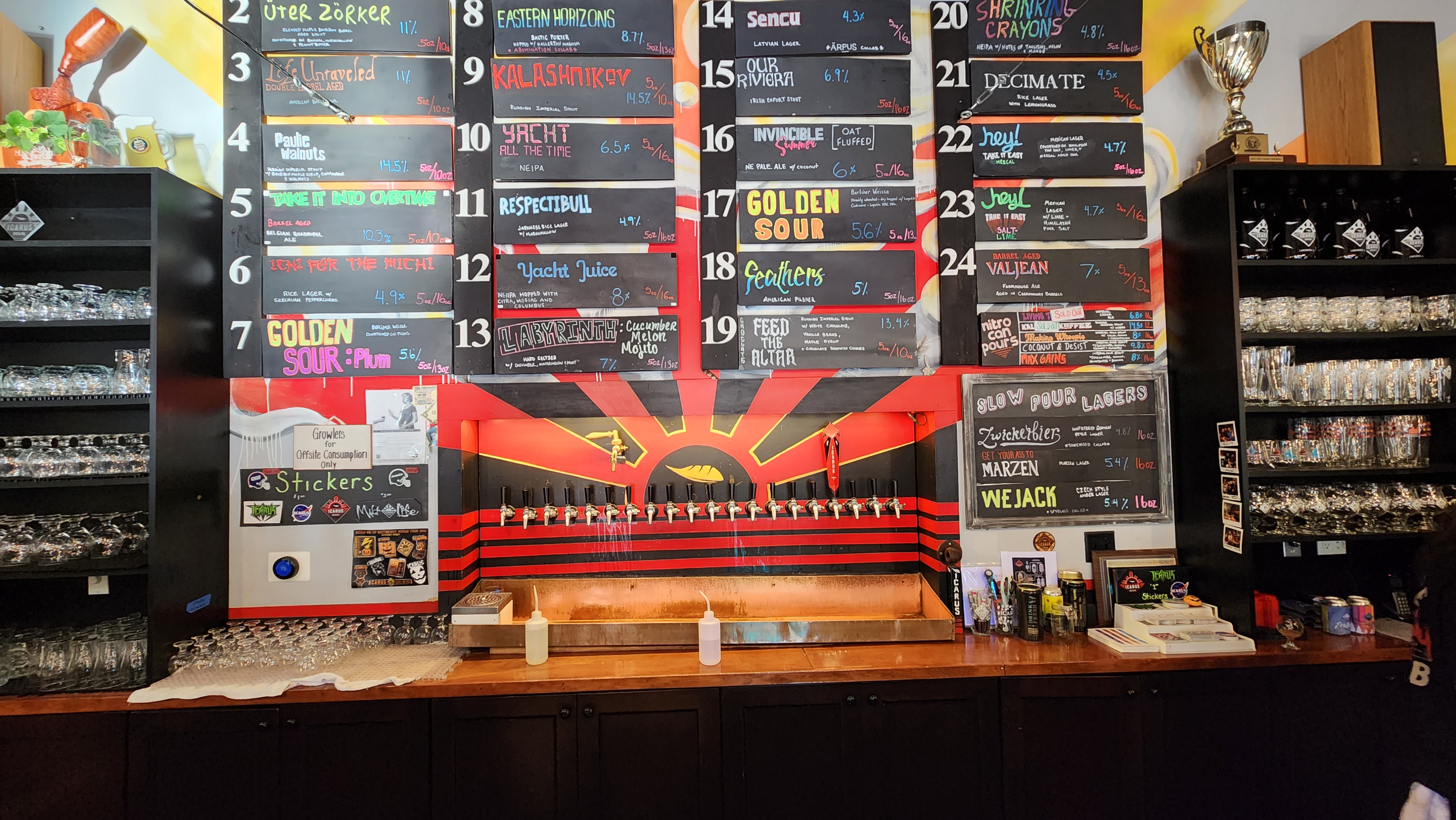 We were joyously welcomed by four exceptionally wonderful bartenders, Alex, Seth, Frank, and Lily, who not only were more than happy to answer our questions but to happily suggest their wide assortment of drinks. Let us say this, everything is great regardless of the style. There are 24 beers on tap and available upon request. Here are some examples of the awesome brews that they have: A Russian Imperial Stout, “Kalashnikov” (w/maple syrup and vanilla beans)…”Zwickelbier” (a German lager)…a Baltic porter, a barrel aged quadrupel ale, “Berliner Weiss” (a sour wheat beer), a Mexican lager, an Irish stout, “Wejack” (a Czech-style amber lager), and a Japanese rice lager that they co-created along with other breweries such as Bolero Snort! There are seltzers, slushies, and other tastes of stouts, pilsners, and ales…the list goes on and on. A couple of their signature beers are Drinking Crayons and Shrinking Crayons (NEIPA) and “Yacht Juice” (a double NEIPA).
