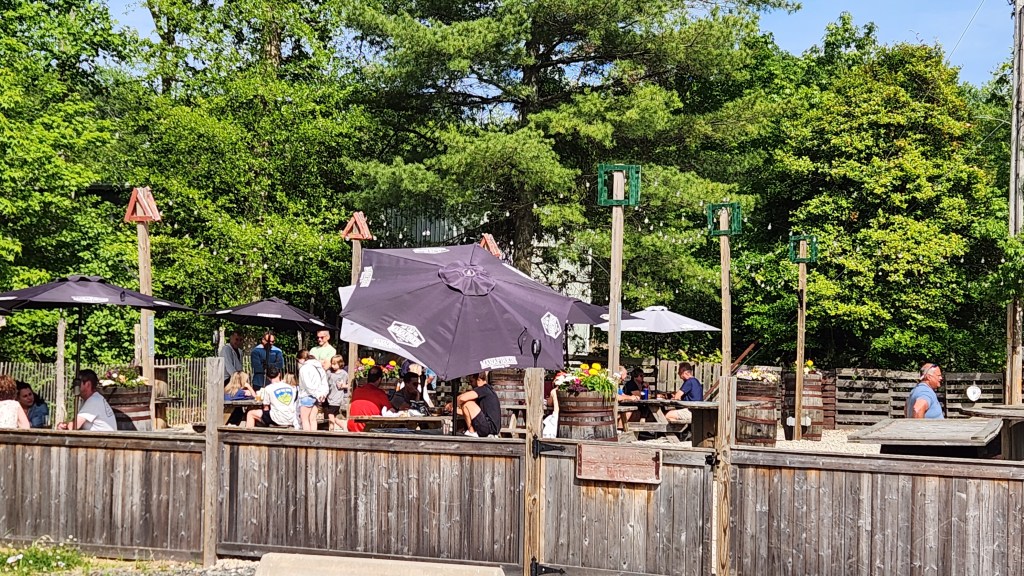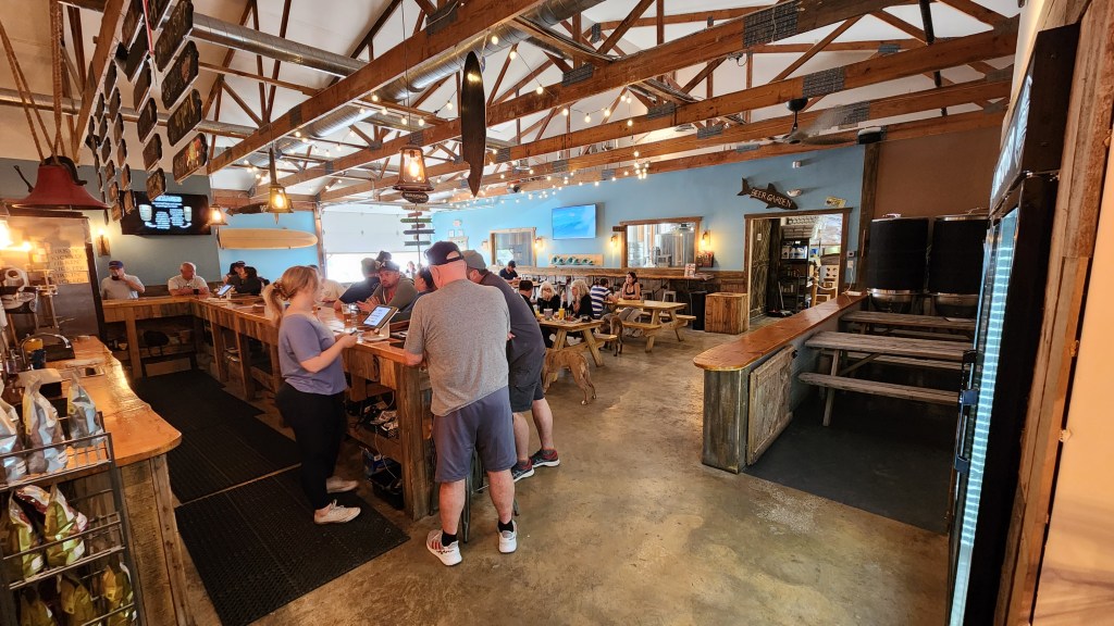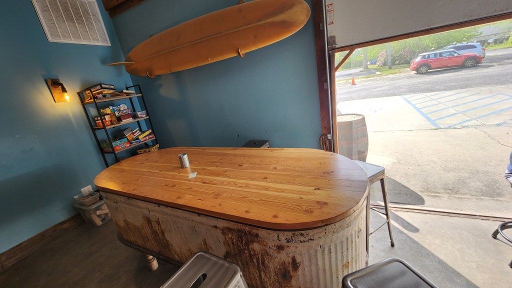 Inside the main building, there are many things that are entertaining and fun to experience. It is a family, child, and pet friendly facility where everyone is welcome! There are plenty of games that are accessible to play. The brewery has a decent sized gift shop in which there are MANY things that are available for purchase called the “Brewtique.” This is most likely the biggest gift shop that we have seen at a brewery yet! Scattered around the tasting room/bar area are a lot of enjoyable things to discover. For example, upon entering the building, you will come across a sign that mimics the Notre Dame motto, “Play Like A Champion Today” by stating, “Drink Like A Champion Today”…good stuff! I love it! There is a big screen TV mounted on a side wall showing all kinds of surfing videos and other water-related films. The woodwork of the tables is just beautiful…great workmanship!! Besides these beautiful tables, there are also picnic tables available along with another space, separate from the tasting room, where you can partake in a tasty drink. One other fun item to see is the beer keg urinals in the unisex bathrooms…we have never seen one before…VERY interesting!!
