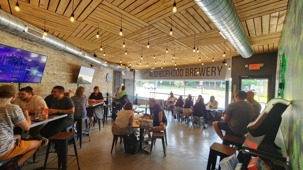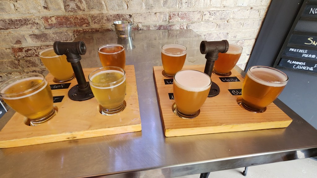 The motto for the establishment is “Your Neighborhood Brewery” and you will certainly feel right at home. The General Manager and Social Manager, Maddie, served us our drinks…you couldn’t ask for a nicer and friendlier person to meet! The beer was good. There were lagers, IPA’s, sours, seltzers, hefeweizen, an ale, and non alcoholic drinks. Their signature brew, the “Toolbox Day,” is a flavorful American IPA and, “Maddie Bo” is an excellent American lager named after the general manager, Maddie! By far, the most popular drink is the NEIPA, “Never Stop in the Circle.”
