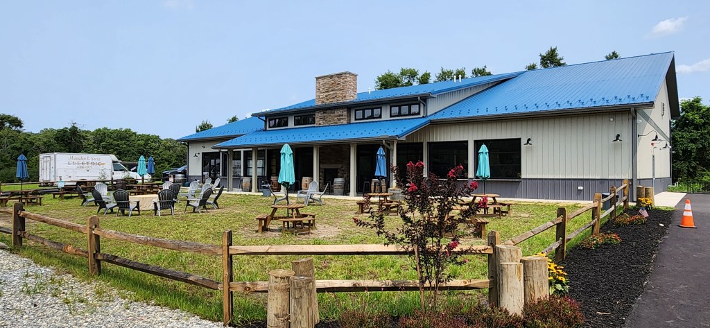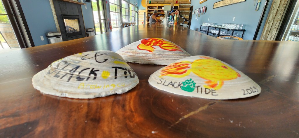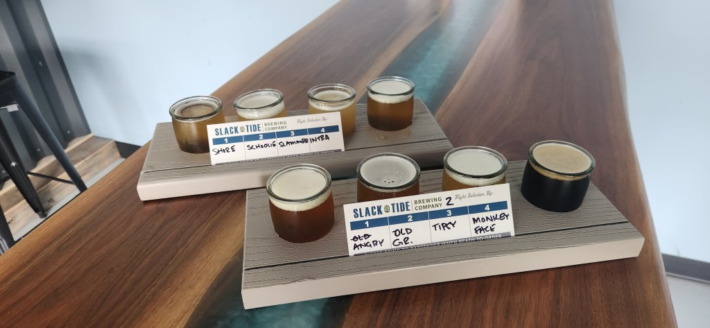 We visited the Slack Tide Brewery in its new location and found it to be a beautiful, clean, and fresh establishment. It features a very pleasant outdoor seating area complete with picnic tables, umbrellas, a fire pit, and an indoor/outdoor fireplace to sit and enjoy your drinks.