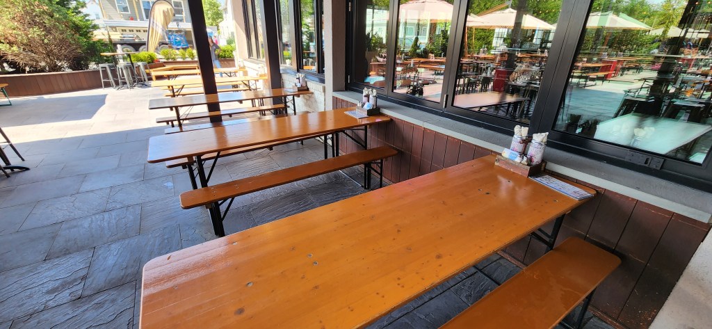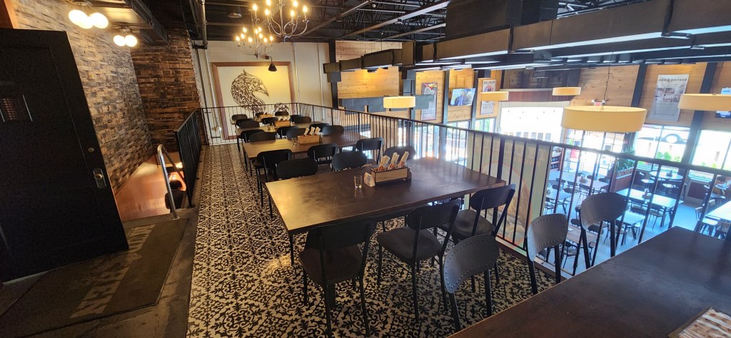 There are FOUR bars, an upstairs loft w/ a bar, an huge outdoor seating area complete with a fire pit, corn hole games, and another bar, and a very nice outdoor patio in the front of the establishment! The indoor and outdoor areas are very spacious, relaxing, and comfortable…great places to have one of their great beers and listen to music during their live events (and/or dining pleasure). Our waiter, Clark, was one of the nicest, friendliest, and helpful people that we have met…definitely made us feel right at home!