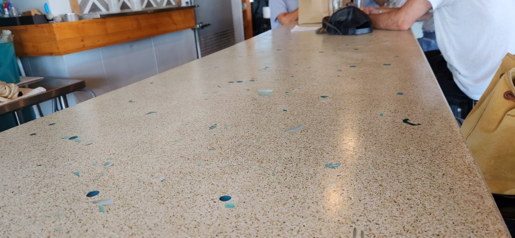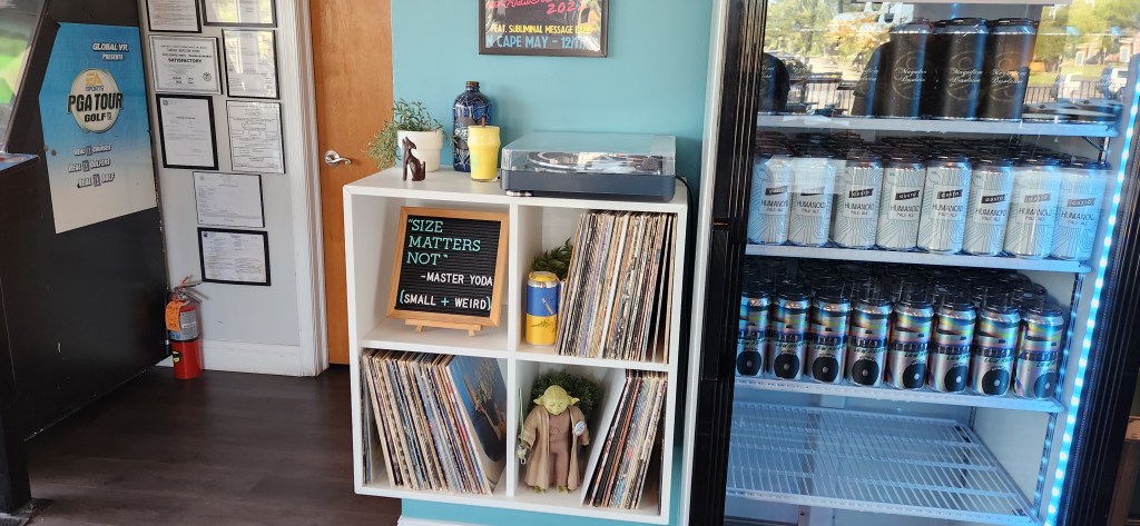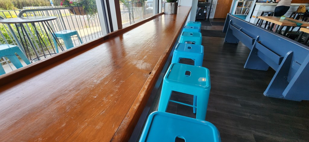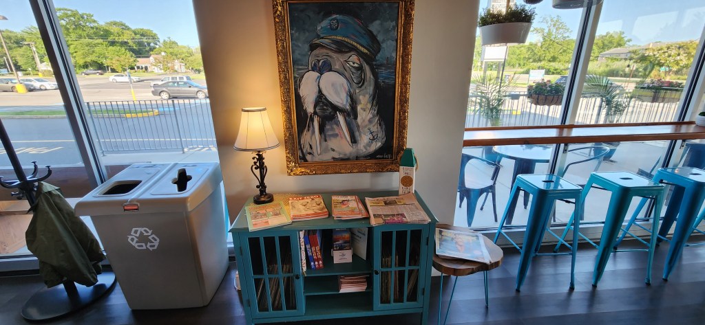 The brewery has a nice little outside seating area in which you can bring your pet Outdoors only), sit and enjoy the invigorating ocean breeze. The indoor taproom is a comfortable and welcoming area which contains marvelous wooden tables with a blue polymer mixed in. The bar is also a gorgeous work of art. There are records that are played at certain times and there are many games available to play and a nifty video golf game!