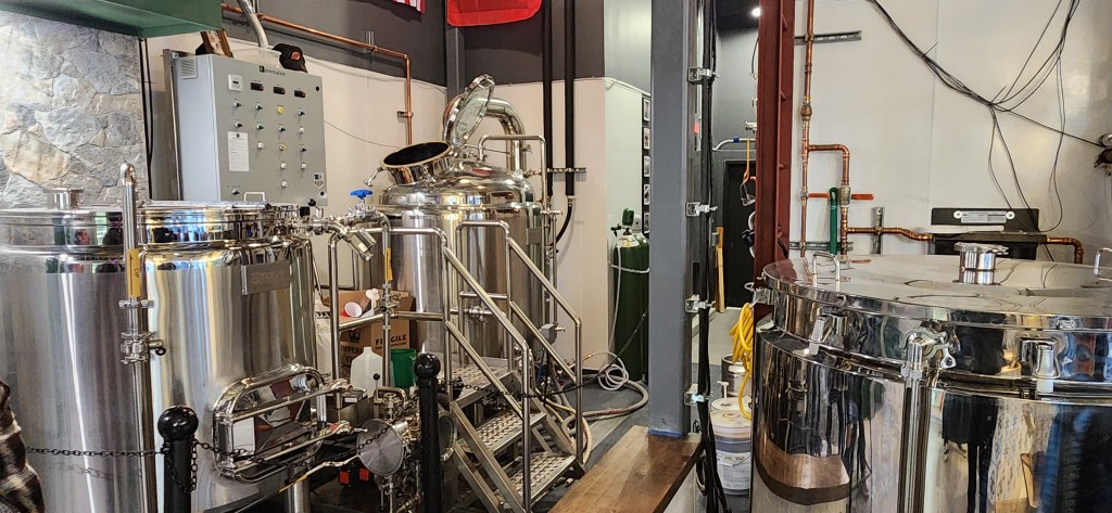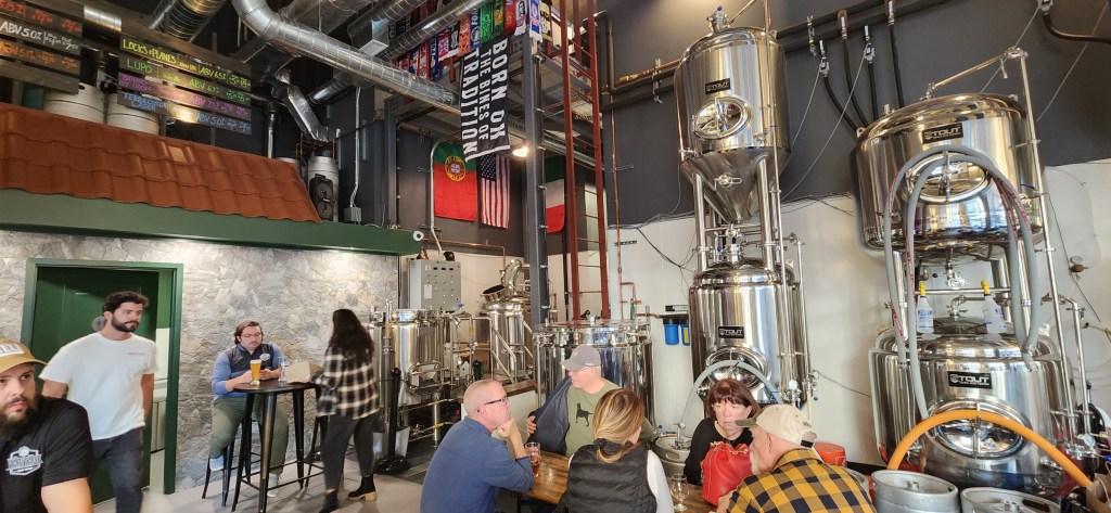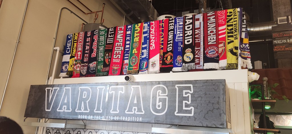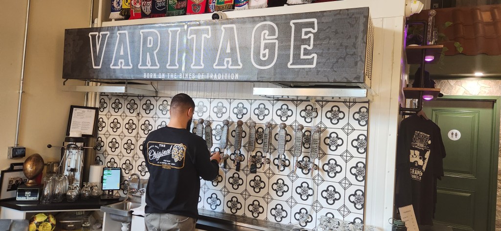 The next time you are in the northern New Jersey area, we have some great news for you…there is a brand new craft brewery in Bloomfield, the Varitage Brew Works! Varitage will be one of the cornerstones of the city’s revitalization program and it promises to be a location that people will enjoy for a long time. We instantly felt right at home and were welcomed not only by the two wonderful beertenders, Joey and Oliver, but also by the optimistic and good-natured co-owner, Mark Costa. The decor is hip, mindful, and well thought out…even the tiles behind the taps were creatively customized. The brewing kettles and tanks are located in the tasting room and add to the charm of the tasting room. Since soccer is beloved by the owners, there is plenty of soccer memorabilia located around the tasting room area…such as three soccer teams from three of the local schools and over 20 different kinds of soccer scarves located just over the beer taps and the beautifully crafted wooden bar. Pictures of the owner’s family members and friends are dispersed on the walls, displaying their heritage with the customers. The whole feel of the brewery is that of a European cafe..it really is wonderful. During warmer weather, the entire street in front of Varitage is blocked off, giving the customers a relaxed and enjoyable venue to enjoy a cold beer.