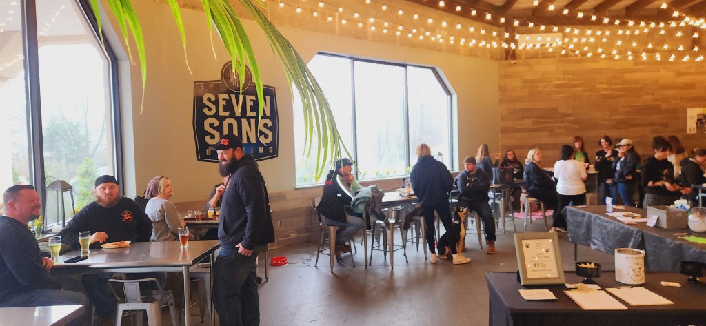 If you are visiting or live in central New Jersey, there is a charming, family owned craft brewery that we think that you should visit, the Seven Sons Brewery, located just off of Route 9 in Howell township. The interior design has a simple, clean industrial feel to it and the environment is welcoming and inviting. The brewery’s kettles and fermenters also add to the decor of the room. There is a nice little lounge area complete with plush couches surrounding a large screen TV that is a comfortable area to relax. The brewery is VERY pet and child friendly…a great place to bring your family and furry little friends!