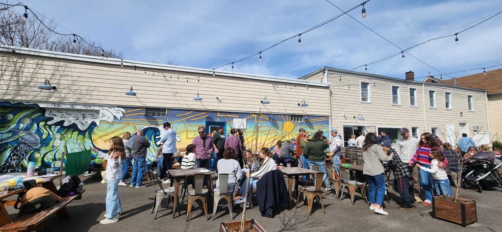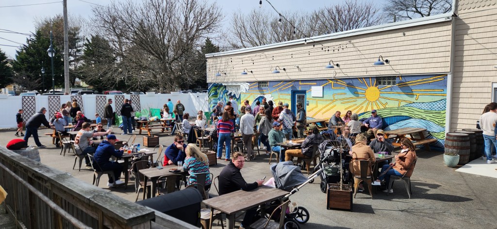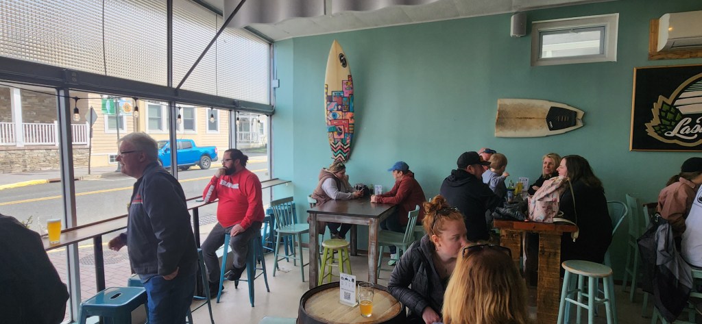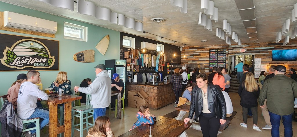 COWABUNGA! Surf’s up dude! That’s the kind of surfing environment you will feel when you visit Point Pleasant’s “Last Wave Brewing Company.” Walking into the brewery, you will instantly feel the beachy vibe and pleasant atmosphere. There are wave-like decorations on the ceiling and the room is painted with a cool green pastel color complete with surfboards, and a very nice couch seating area, raised tables and even picnic tables! There is a large outdoor patio area that has wooden / beachy-style tables and chairs along with more picnic tables. There is a very cool looking mural painted on the outside wall of the brewery. This is a great outdoor area to hang out with friends and family to enjoy a nice cold brew on a warm day (or anytime 🙂