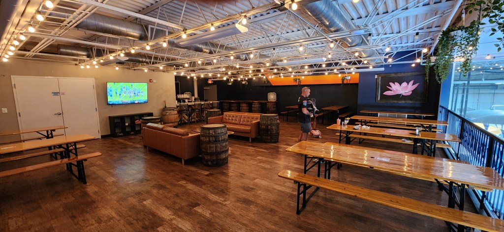 The space itself is impressive: the upper level is a cozy retreat with TVs, leather couches, and picnic tables, while the main tasting room is vast and inviting. For those seeking a more private setting, there are two smaller lounges featuring window seating, big lounge chairs, and wooden picnic-style tables—perfect for hosting events or simply unwinding.