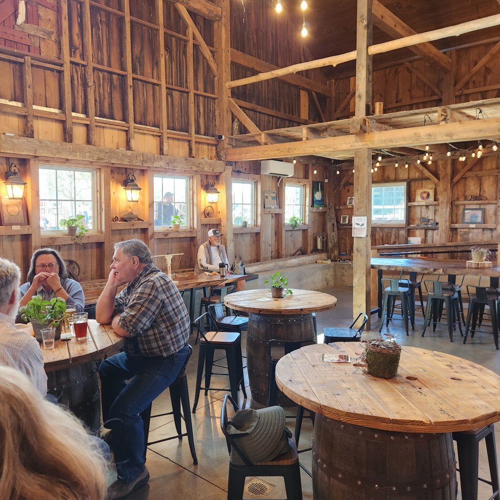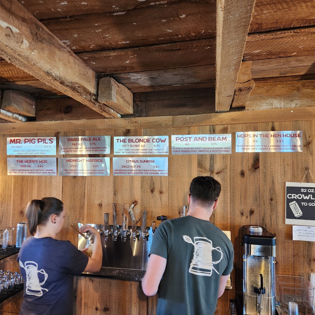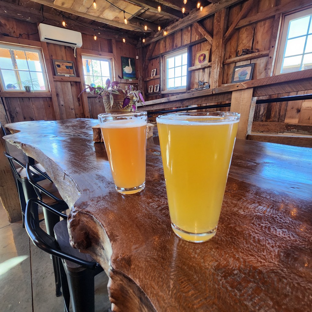 Outdoors, the space really shines. There’s an expansive beer garden with plenty of picnic tables, a family area with a gaga pit, and even a small pond complete with a miniature bridge. Live music fills the air on weekends, and kids are free to explore while parents sip on pints. Animals roam nearby, including cows and other farm favorites that guests can pet, making it every bit a working farm as well as a brewery.